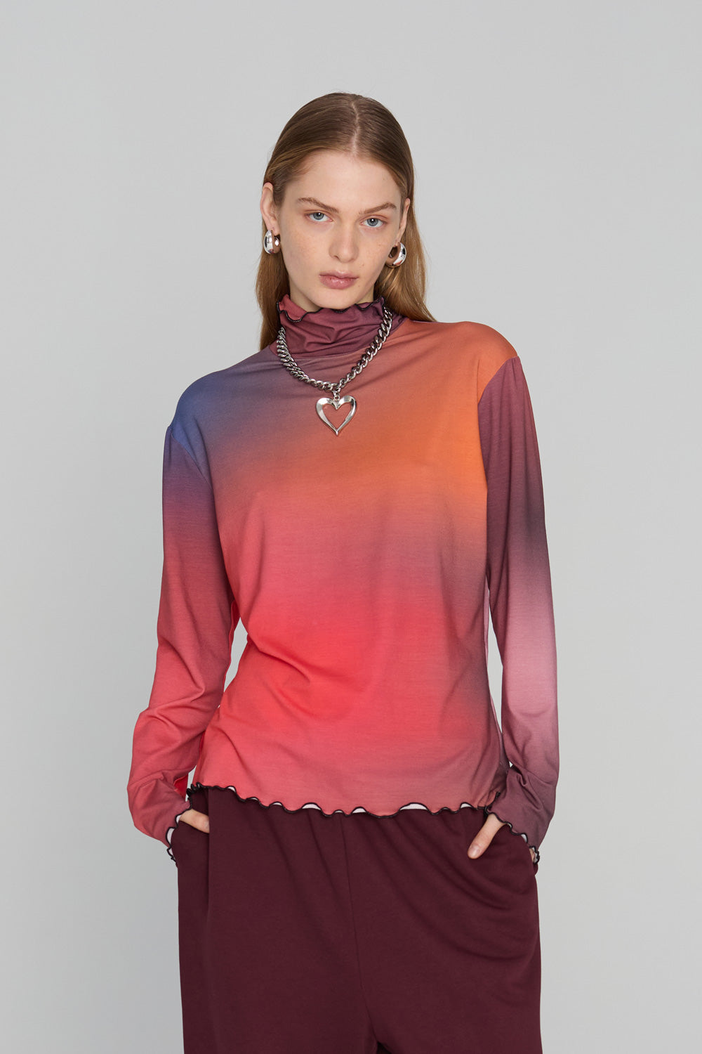 A loose cut made of soft, flowing knit fabric with a unique pattern. The stand-up collar, sleeves, and hem are adorned with contrasting hemstitching, lending a romantic touch to the piece.
