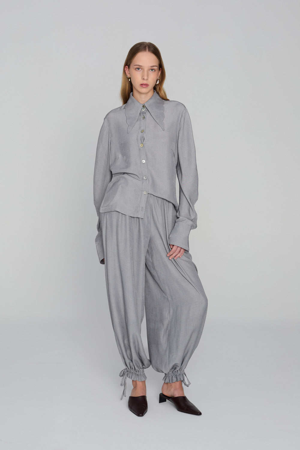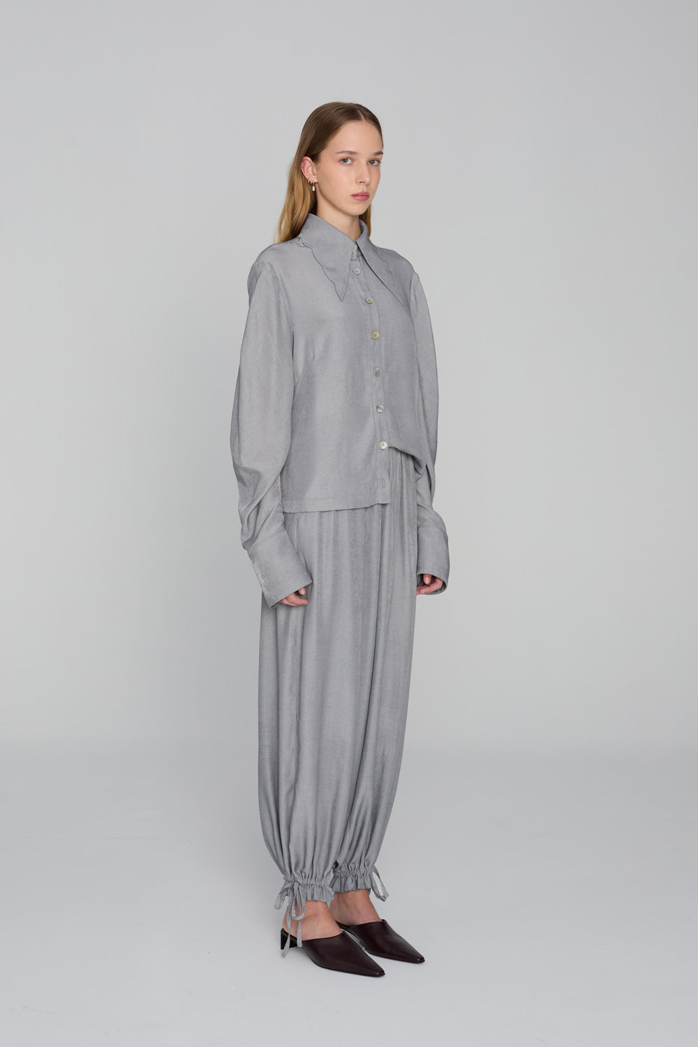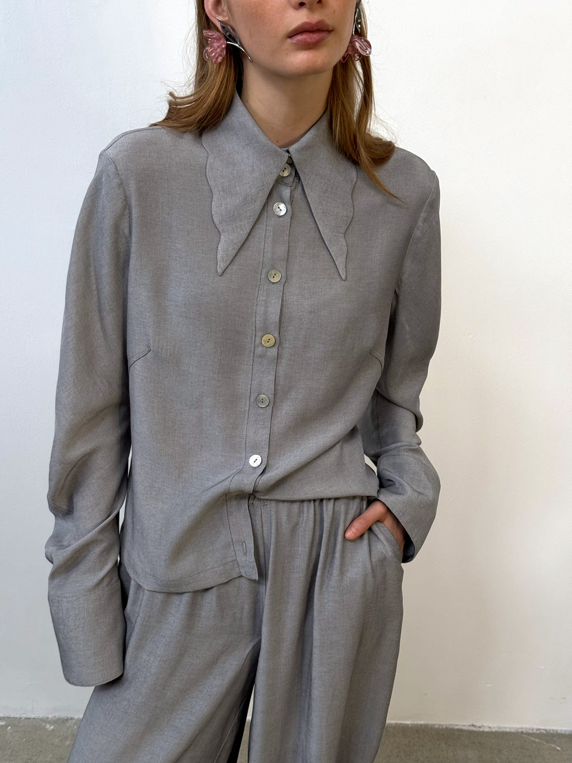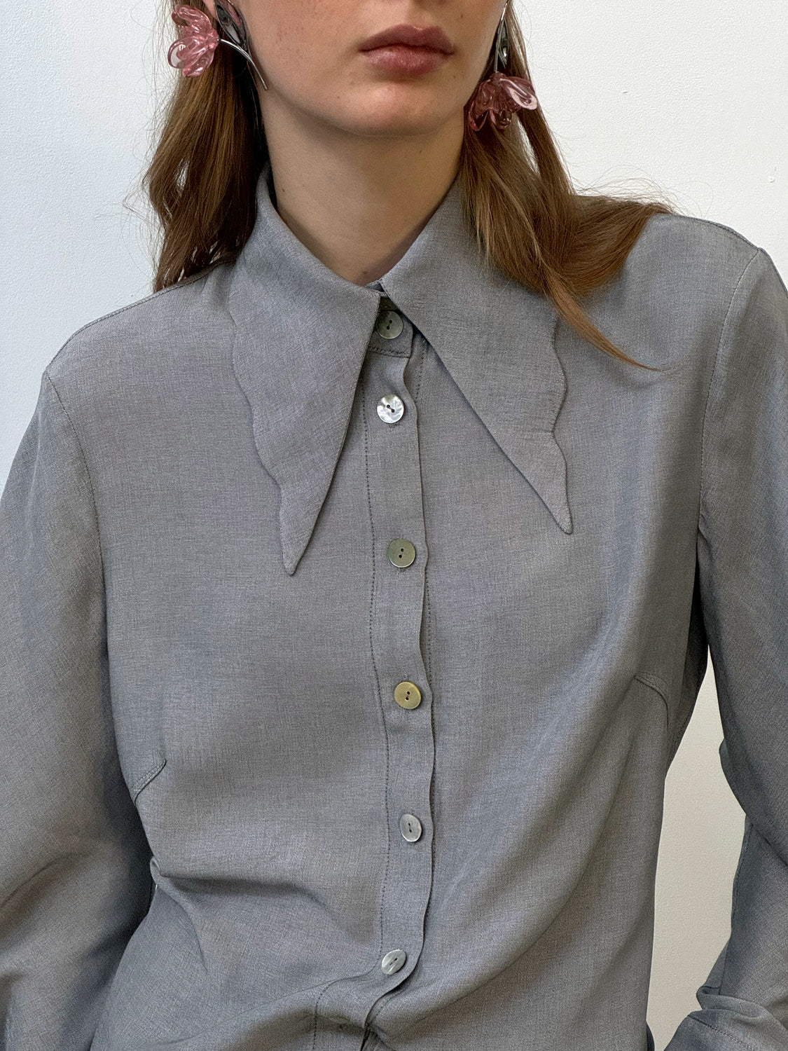 This fitted shirt is crafted from a soft, flowing fabric with a touch of viscose. It features a V-neck collar with a subtly scalloped edge and gently flowing sleeves, creating a fluid and airy feel. The darts accentuate the silhouette, and the soft fabric drapes elegantly over the body, creating a sensual, feminine silhouette.