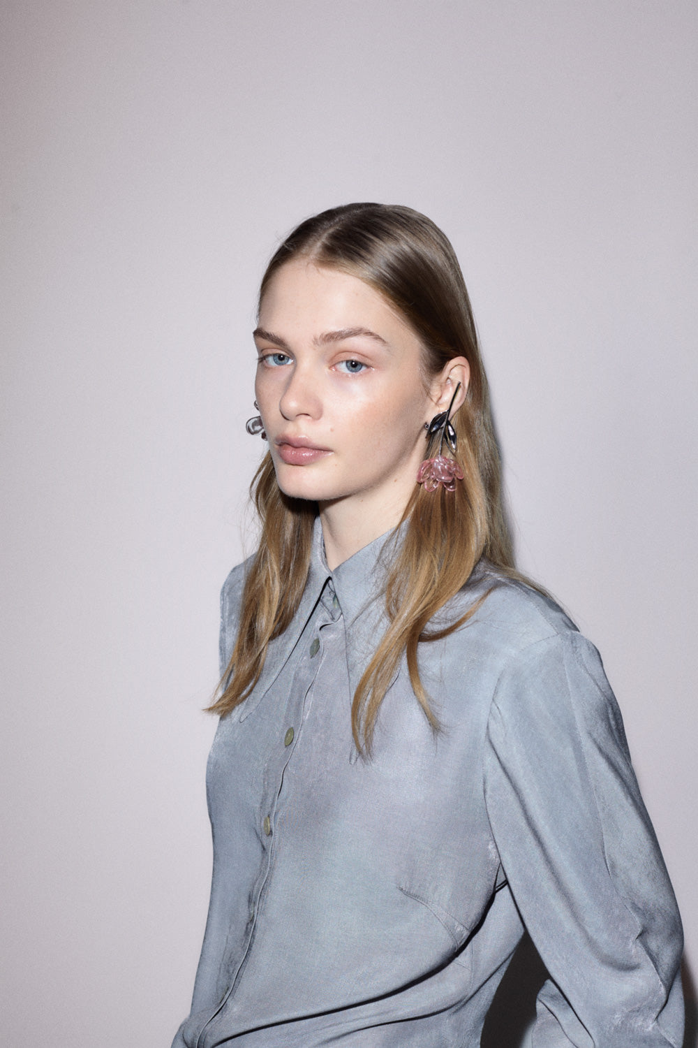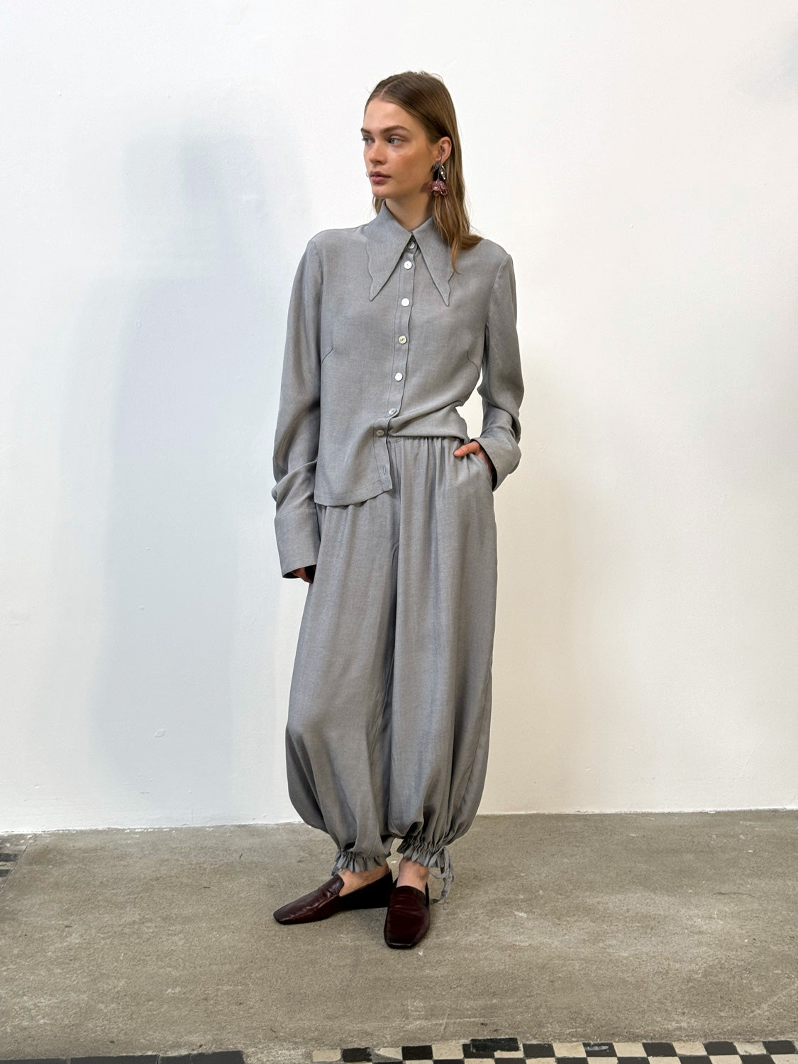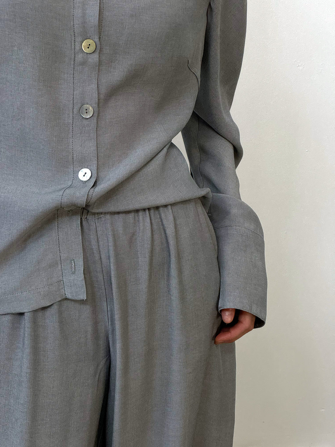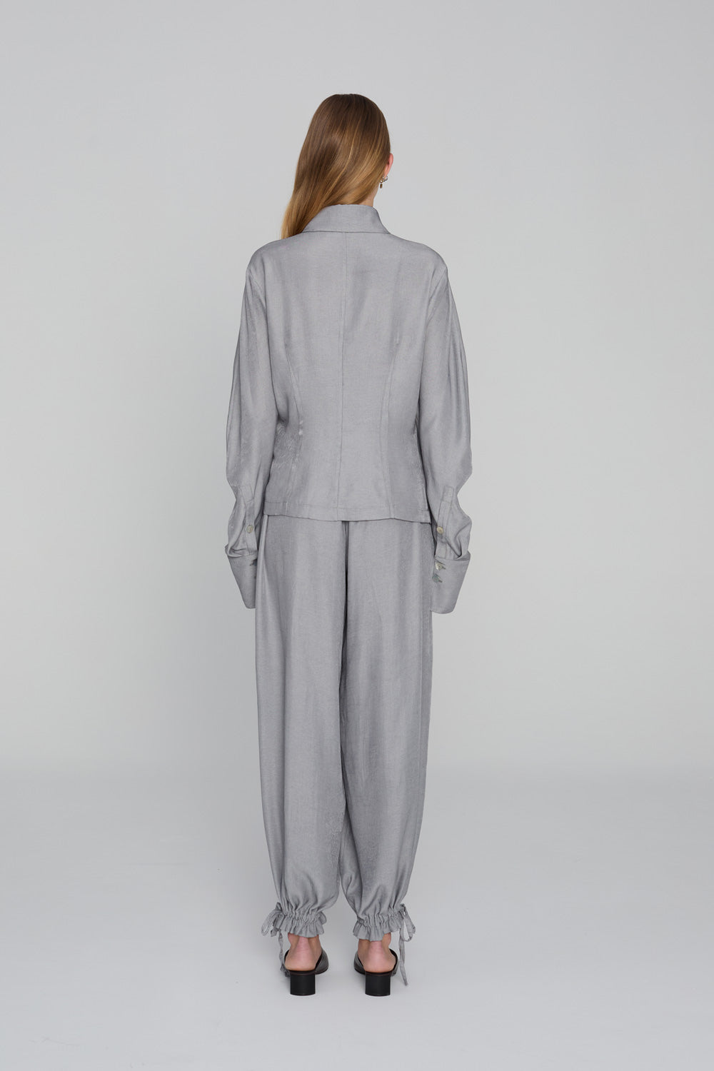 This fitted shirt is crafted from a soft, flowing fabric with a touch of viscose. It features a V-neck collar with a subtly scalloped edge and gently flowing sleeves, creating a fluid and airy feel. The darts accentuate the silhouette, and the soft fabric drapes elegantly over the body, creating a sensual, feminine silhouette.