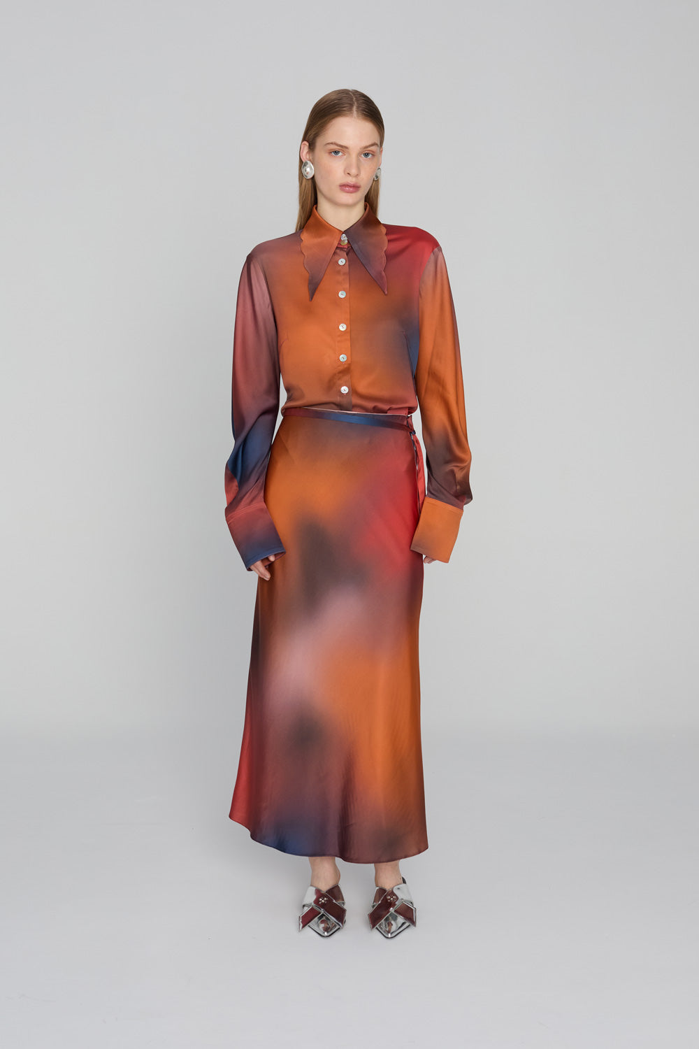 This fitted shirt is crafted from a soft, flowing fabric with a touch of viscose. It features a V-neck collar with a subtly scalloped edge and gently flowing sleeves, creating a fluid and airy feel. The darts accentuate the silhouette, and the soft fabric drapes elegantly over the body, creating a sensual, feminine silhouette.