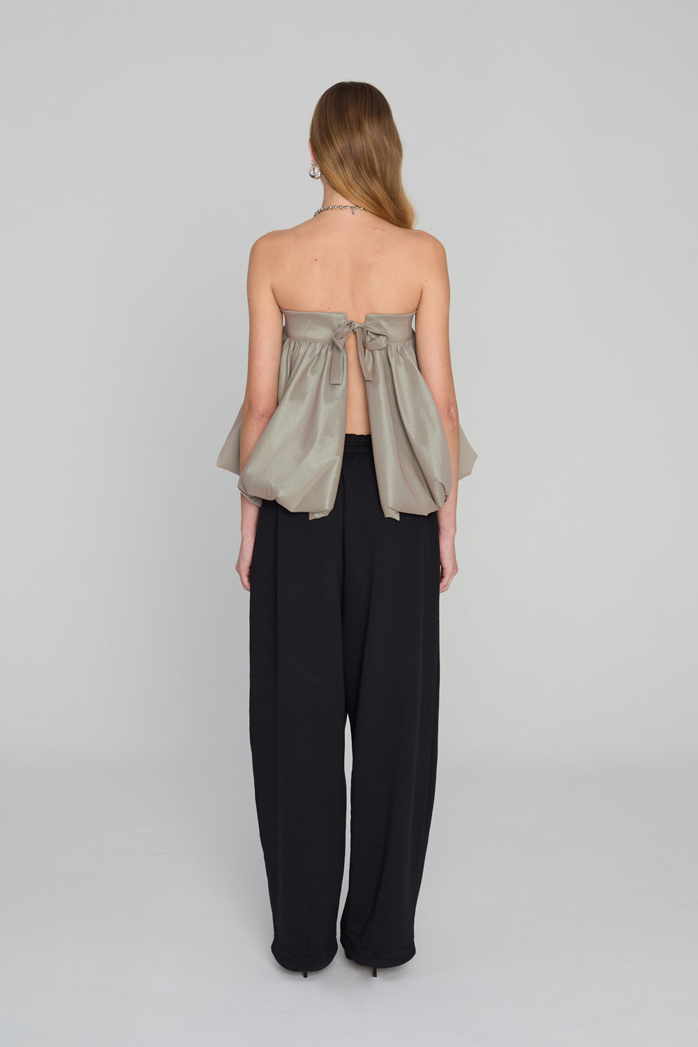 MARIBEL is a transforming wardrobe staple—a top, a skirt, an apron, or even a cape. It all depends on how you tie it. Made of stretchy gray jersey with a gorgeous pink sheen, it's lightweight, sculptural, and playful—it changes shape with you.