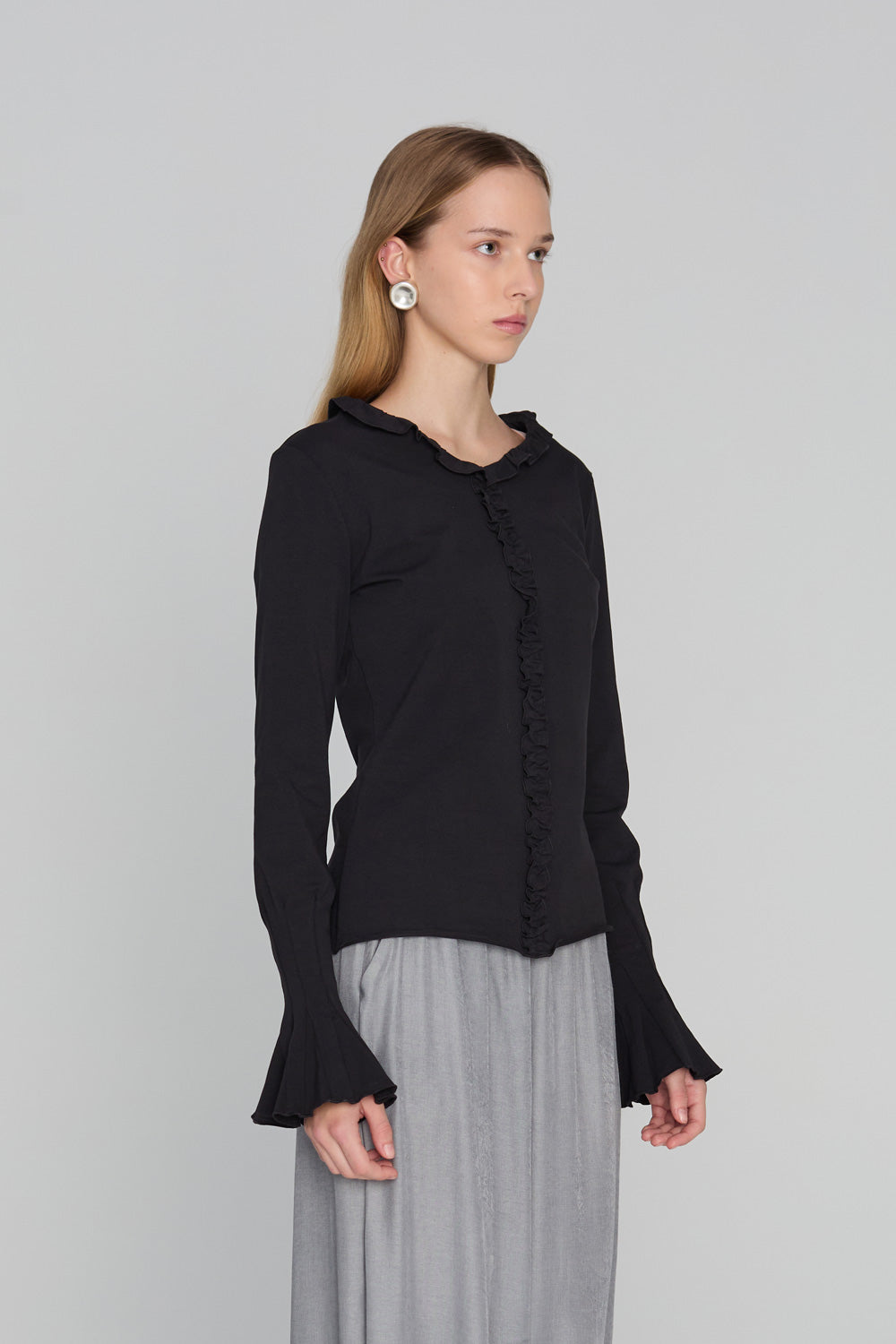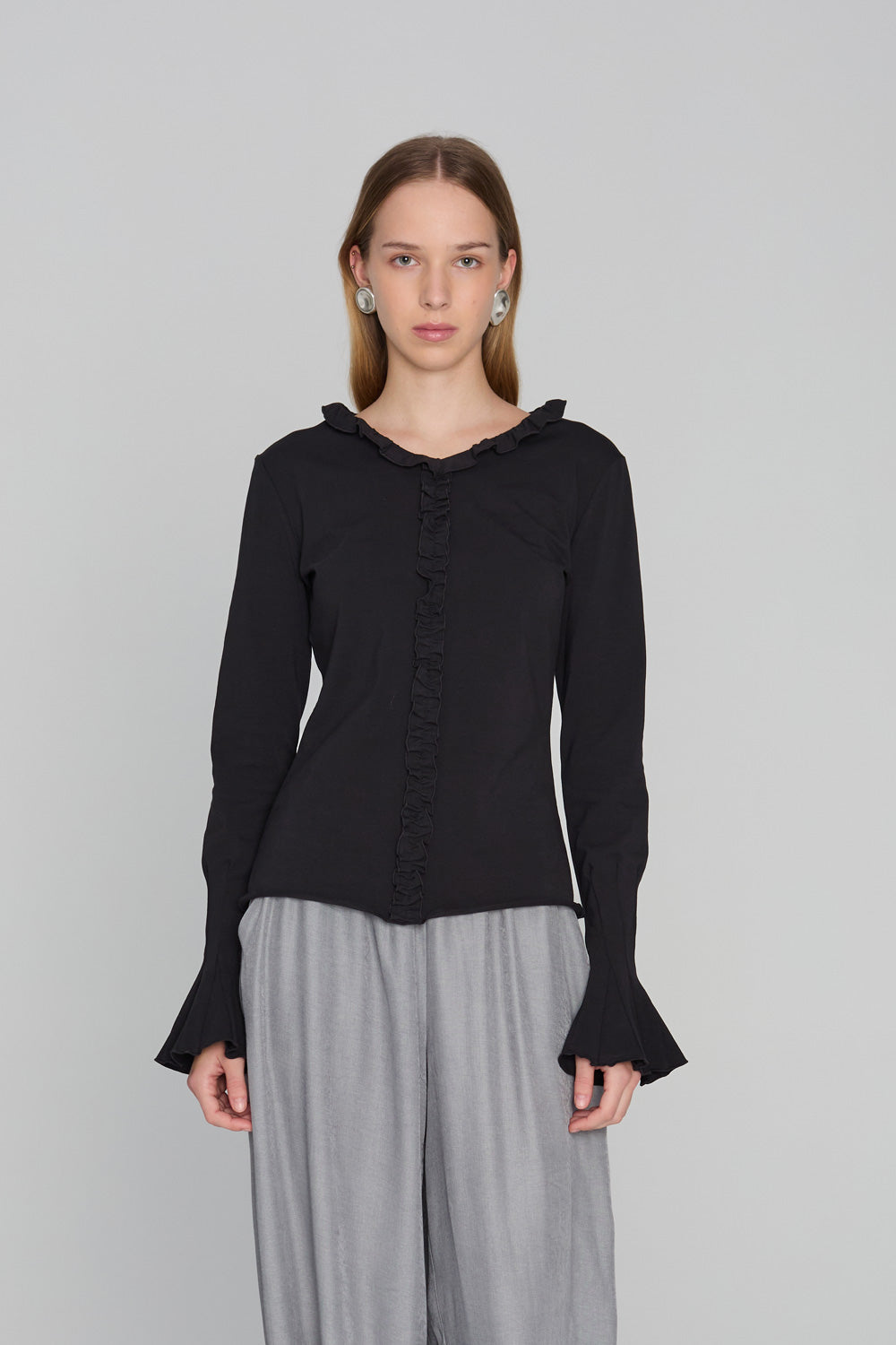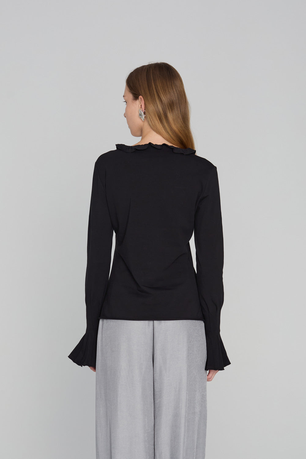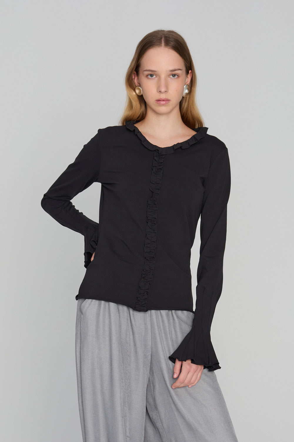 A fitted cut made of soft, black jersey. The neckline and front are adorned with delicate ruffles, lending a romantic touch. The flared sleeves, inspired by a flower calyx, subtly sway with movement. All edges are finished with decorative hemstitching.