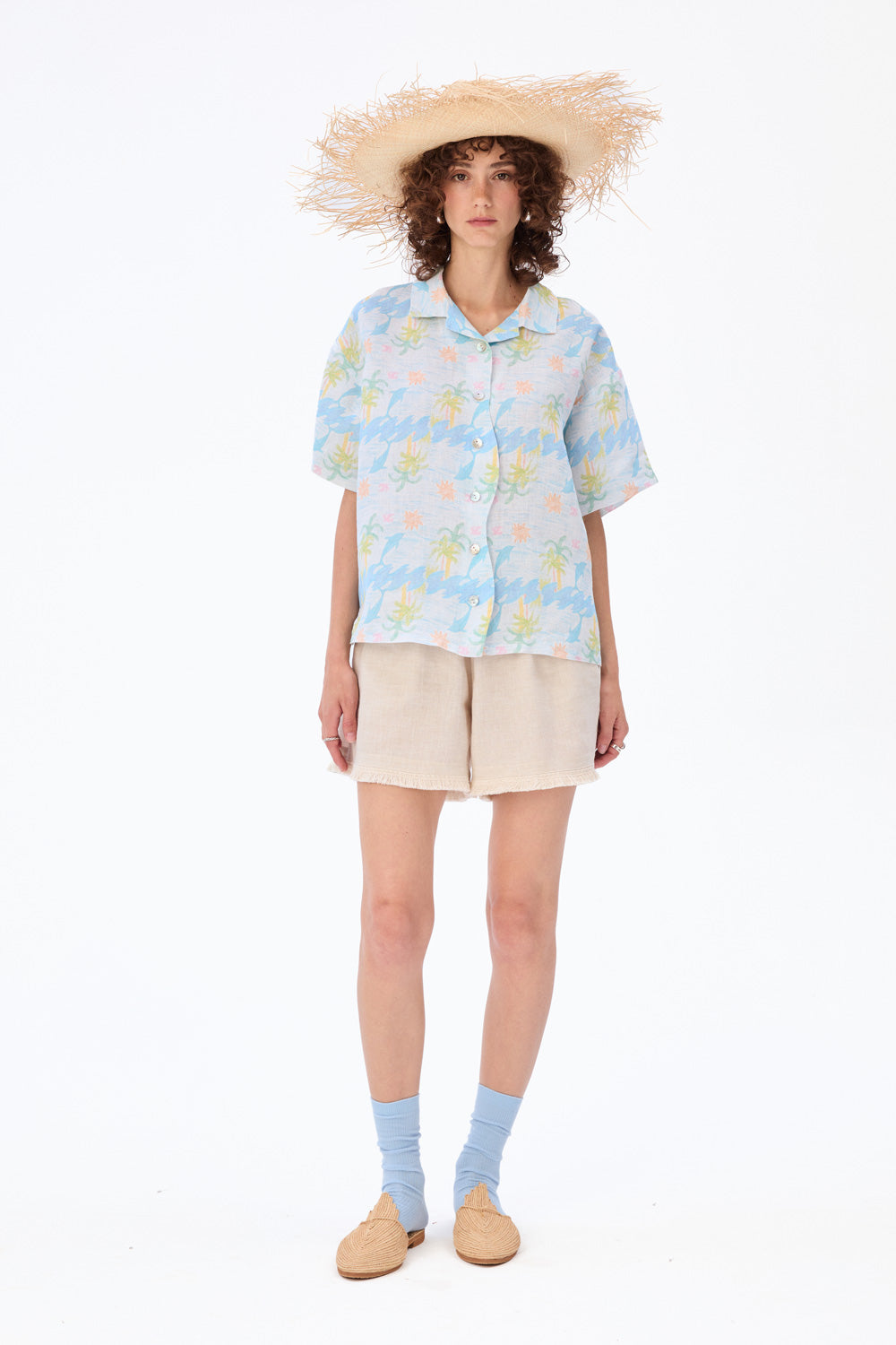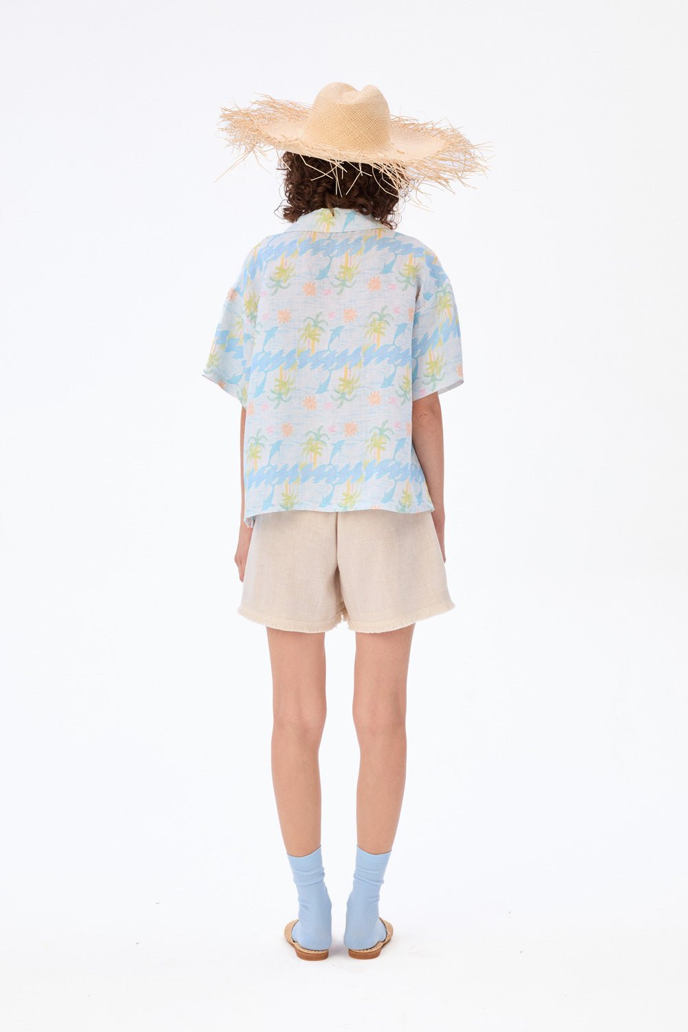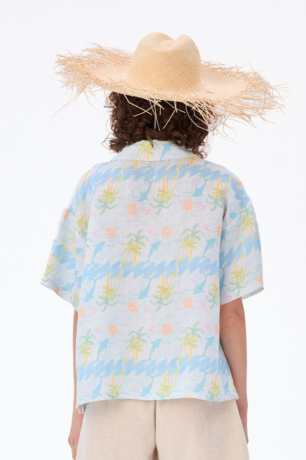 Luźna koszula w egzotyczny wzór z delfinami, która kusi wakacyjną nostalgią. Klasyczne detale – kołnierzyk, krótkie rękawy i guziki z masy perłowej – spotykają się tu z fantazyjnym, falującym zapięciem, które płynie w rytmie letniego chilloutu.
