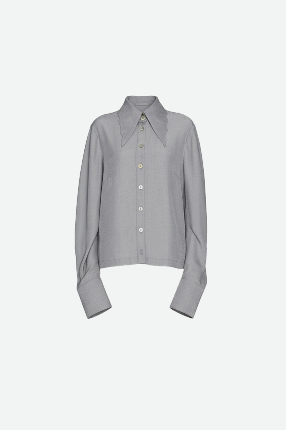 Dopasowana koszula uszyta z miękkiej, lejącej tkaniny z dodatkiem wiskozy. Ma kołnierz w szpic o subtelnie falowanym brzegu i delikatnie spływające rękawy, które nadają całości płynności i lekkości. Zaszewki podkreślają sylwetkę, a miękki materiał układa się elegancko na ciele, tworząc zmysłową, kobiecą linię.