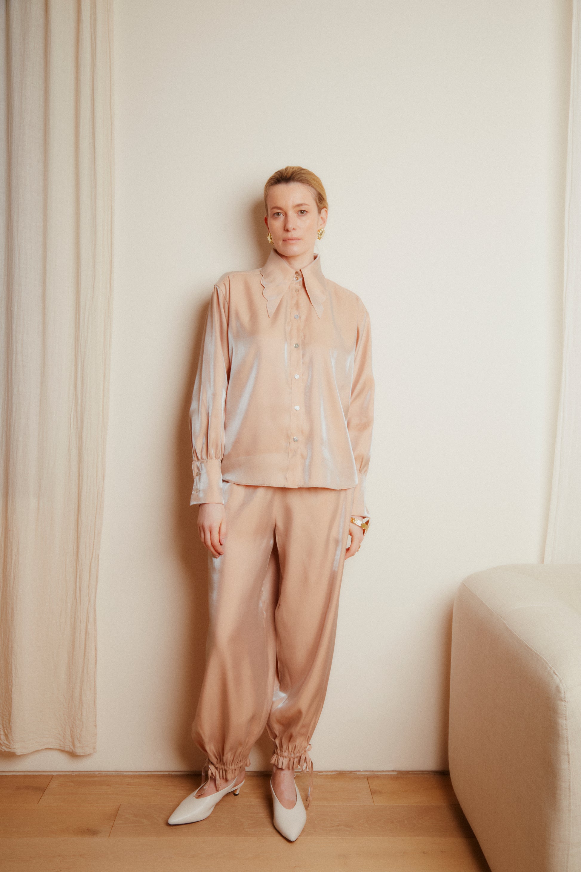 Model o swobodnej, naturalnie układającej się linii koszula opływa sylwetkę w miękki, płynny sposób. Kołnierz w szpic z subtelnie falowanym brzegiem dodaje finezji, a delikatnie opadające rękawy nadają całości lekkości i kobiecej elegancji. Materiał pięknie pracuje w ruchu, tworząc zmysłową, nowoczesną formę.