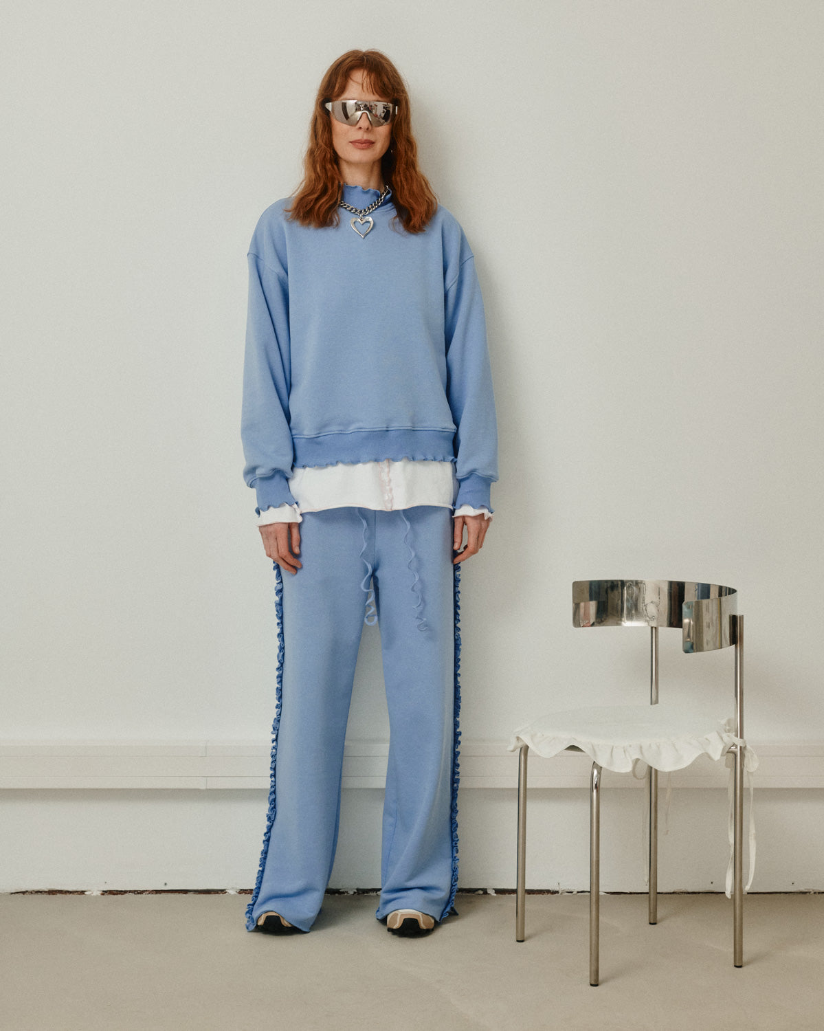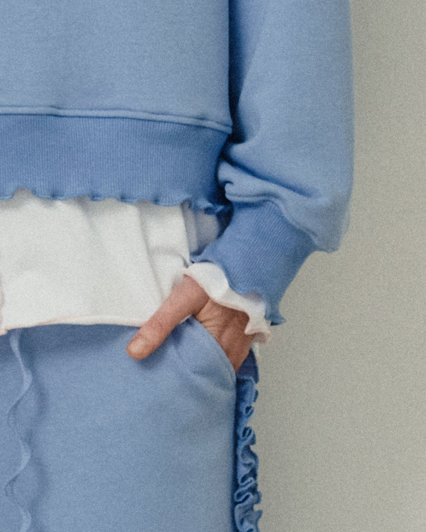 Luźny krój. Falbanka z przodu. Haft z różowym delfinem. Różowa mereżka jako delikatny akcent na krawędziach. Surowe, odsłonięte szwy dla wyrazistego efektu.