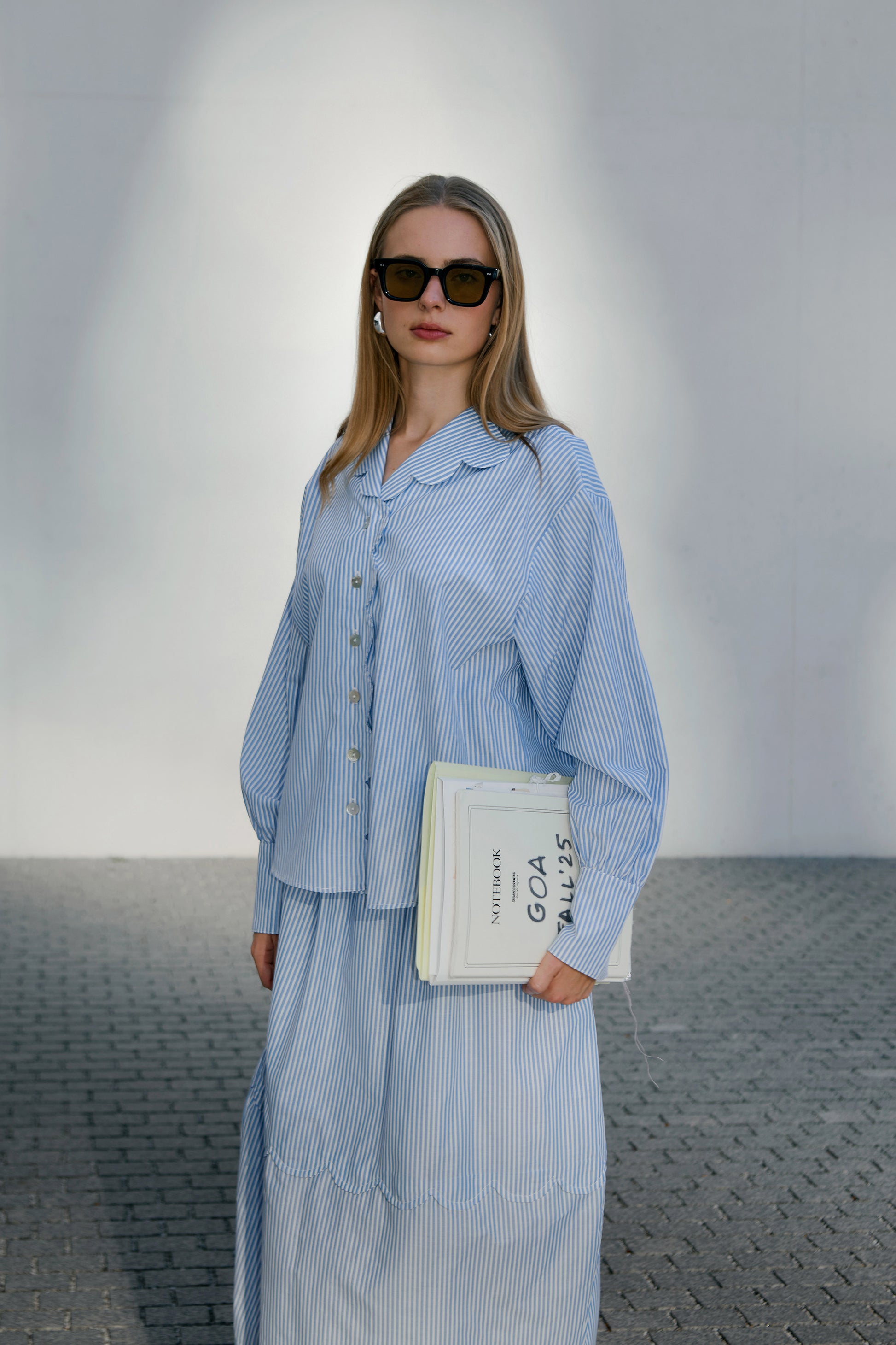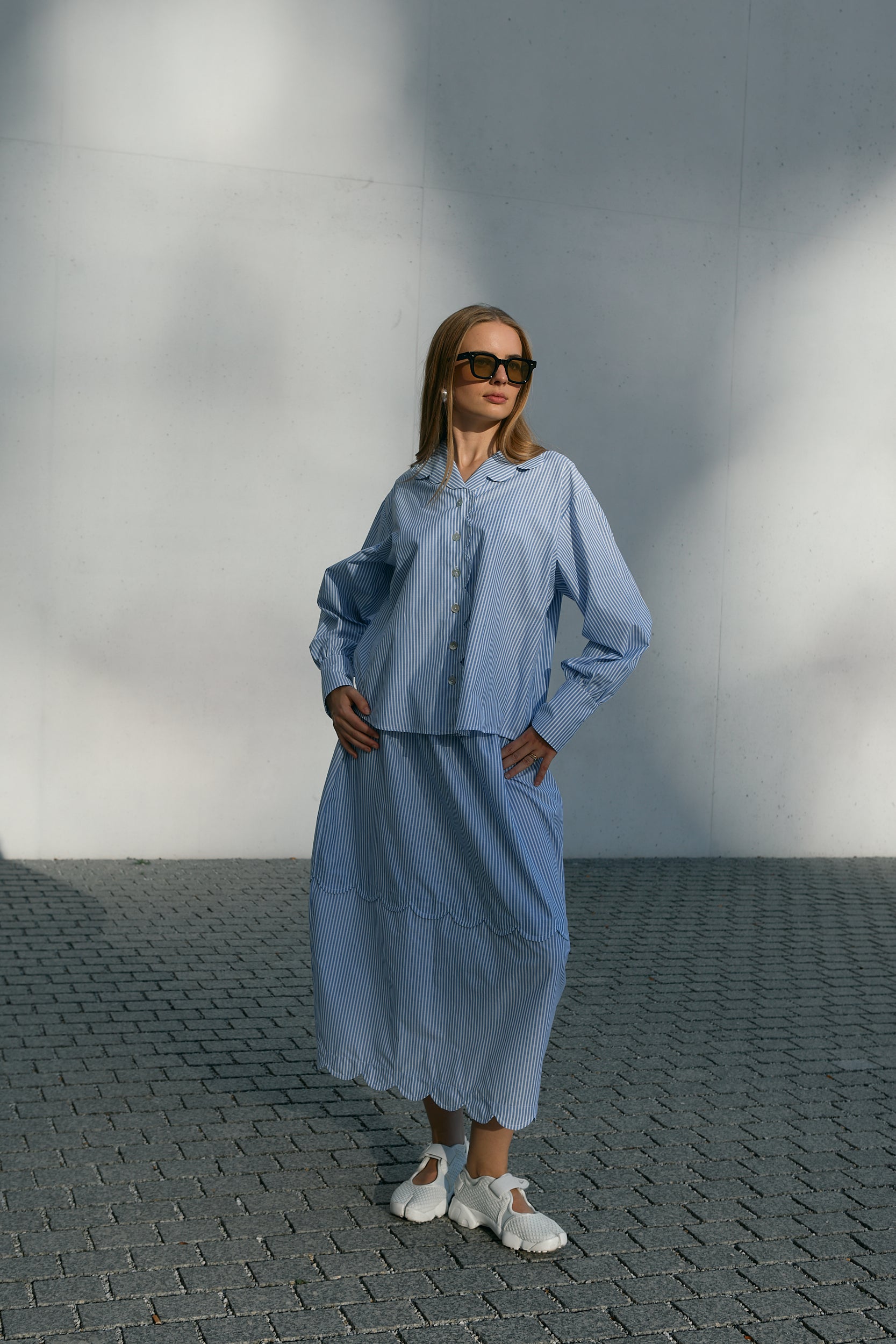 Spódnica midi o nowoczesnym kształcie typu barrel, uszyta z wysokiej jakości mieszanki 60% bawełny i 40% poliestru. Jej charakter podkreślają oryginalne detale: poziomy pasek materiału układający się w falującą linię oraz wykończenie dołu w kształcie subtelnych falek. Funkcjonalności dodają praktyczne kieszenie, a długość midi sprawia, że spódnica łączy elegancję z codziennym komfortem. To wyjątkowy model, w którym gra pasków i fal tworzy harmonijną, artystyczną całość.