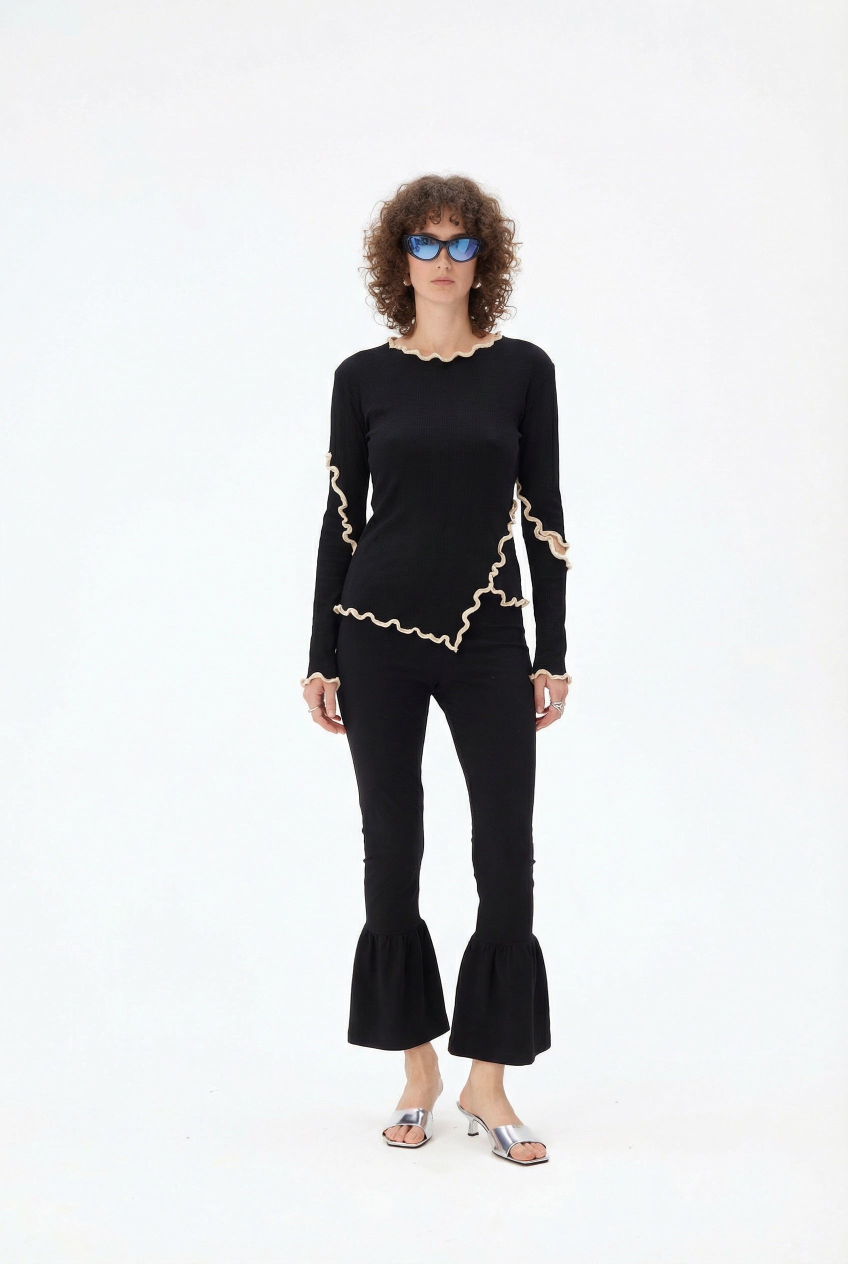 Dopasowane dzianinowe spodnie o długości 3/4, zakończone szeroką, falującą falbaną. Elastyczna tkanina otula ciało jak legginsy, a wygodna gumka w pasie daje pełną swobodę ruchu – bez rezygnacji z efektu wow.